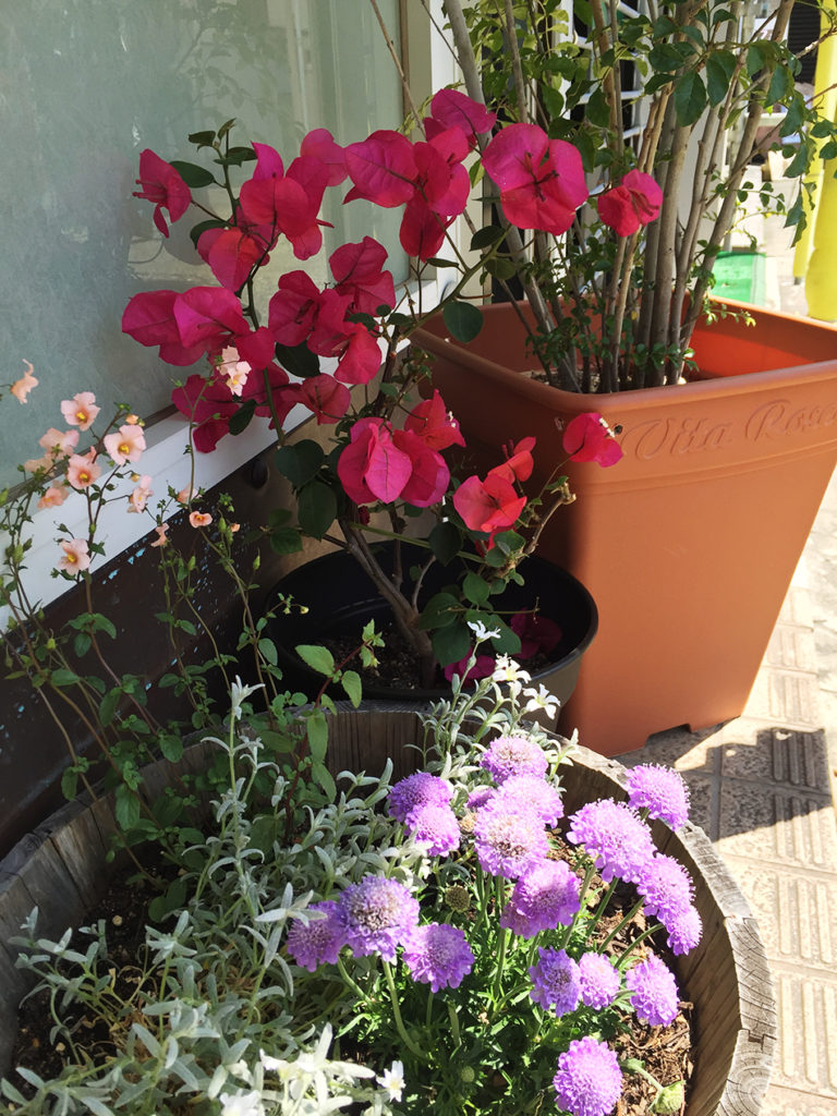 後ろで咲いているのはブーゲンビリアという花です!